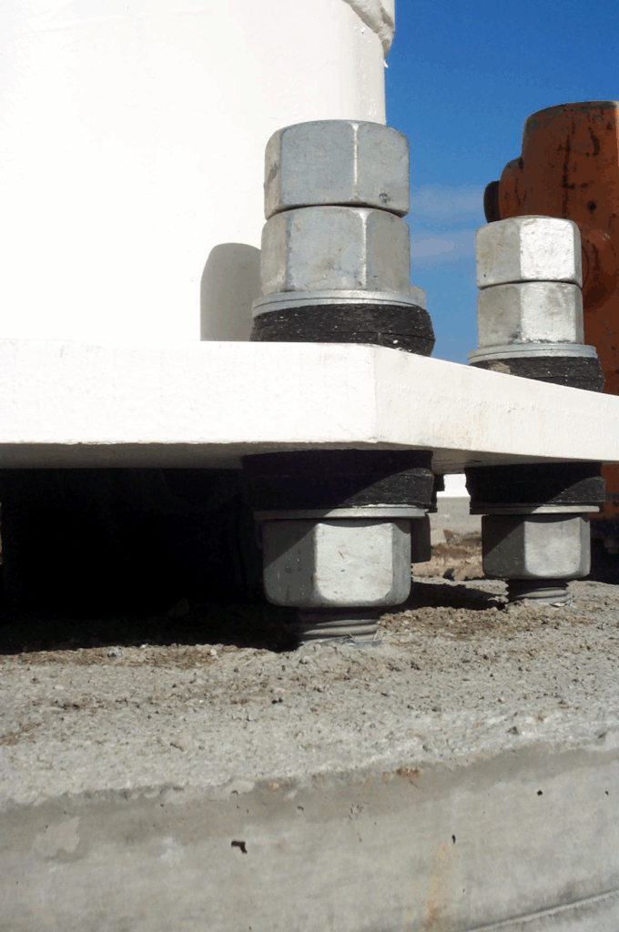 Fiber reinforced elastomeric dampers were installed on both sides of the light pole base plates that provided enough stiffness to keep the lights plumb, enough strength to not fail under the combined pole and lighting weight and storm wind moment, and enough damping to solve the problem. This innovative method was practical and low cost to implement on existing and future light poles.